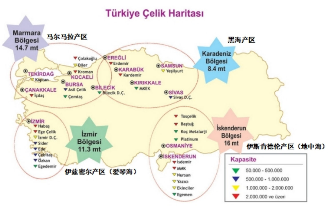 根據(jù)土耳其鋼鐵生產(chǎn)協(xié)會(huì),目前土耳其鋼鐵生產(chǎn)主要分為四大產(chǎn)區(qū):馬爾馬拉產(chǎn)區(qū)(產(chǎn)能:1470萬噸)、伊茲密爾產(chǎn)區(qū)(即愛琴海產(chǎn)區(qū),產(chǎn)能:1130萬噸)、伊斯肯德倫產(chǎn)區(qū)(即地中海產(chǎn)區(qū)、產(chǎn)能:1670萬噸)、黑海產(chǎn)區(qū)(產(chǎn)能:840萬噸)。